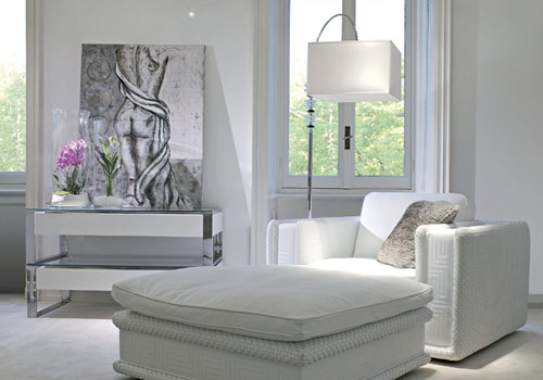 右側(cè)單人沙發(fā)Soft Couture和配套的方形坐墩,白色真皮手縫圖案。沙發(fā)參考價格10000元,坐墩參考價格50000元。靠墻面擺放的是咖啡桌Oscar,金屬結(jié)構(gòu)配有白色上漆抽屜。參考價格77000元。窗前落地燈Round參考價格37000元。