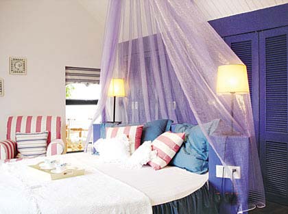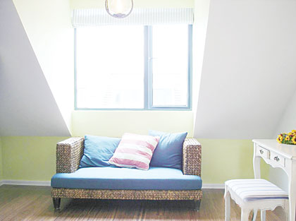 閣樓的房間以藍(lán)白相配的地中海色彩為主。藍(lán)白相配給人以一種干凈、浪漫的感覺,很能彰顯主人的品位。
