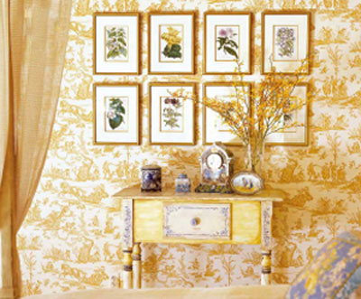挑選畫作時要考慮它們是否與墻上其它裝飾性圖案沖突。畫作的相框色彩與壁紙的柔美色調(diào)吻合,與壁紙相得益彰。