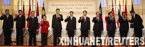 概要: 3月1日,在泰國華欣,參加第14屆東盟首腦會議的領(lǐng)導(dǎo)人與東盟秘書長素林(右一)舉杯慶祝簽署具有戰(zhàn)略意義的多項文件。當(dāng)日,第14屆東盟首腦會議閉幕。新華社/路透新華網(wǎng)泰國華欣3月1日電綜述:東盟峰會成果豐碩新華社記者黃海敏 鄭捷 楊曉紅東盟10國領(lǐng)導(dǎo)人2月27日至3月1日聚會泰國中部海濱城市華欣,出席第14屆東盟首腦會議。