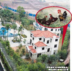 記者看到這4幢別墅中有3幢是毛坯房,院里面有幾名工人正在打掃衛(wèi)生。住在附近的小區(qū)業(yè)主告訴記者,這些別墅一直空置,沒有住人,里面真正的“主人”是一群雞。
