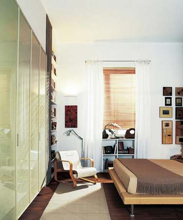 臥室里沿用了一些客廳的色彩和收納方法,留出了較大的臥室空間,避免了擁擠的感覺,便于營造安謐的氣氛。高達天花板的書架和窗下設(shè)置的矮柜讓主人的收藏得到充分的收納和展示。床頭處安排了一面帶有隔板的背景墻,讓臥室和客廳的氣質(zhì)按照主人的喜好形成絕對的統(tǒng)一。床對面設(shè)有高達天花板的衣柜,可以把衣物和床上用品全部收納進去,在衣柜靠窗的一側(cè)還有一個大型的書架,用來擺放書籍和CD,生活里的精神享受得到了極大的重視。