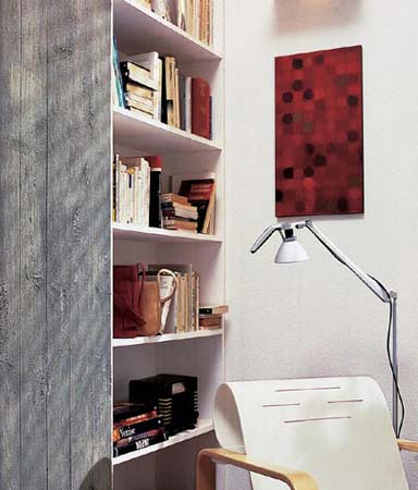 大型衣柜一側(cè)的白色書架延續(xù)客廳書架的收納方法,避免了整面墻的擁堵感,令視覺效果更為豐富。在白色書架旁邊, 安排了一條同客廳一樣的灰色木質(zhì)墻飾,成為豐富墻面表情的細(xì)致之舉。一張椅、一盞落地?zé)簟⒁环t色的裝飾畫,為臥室?guī)戆察o氣氛。
