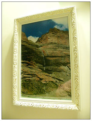 這里可以窺見(jiàn)爸爸的電腦工作臺(tái)(藏在大墻柜里面的),還有他房間上面的得意之作,九寨溝的瀑布,金色相框燈照效果輝煌的說(shuō),我總是遺憾青山碧水可惜沒(méi)有配上**的藍(lán)天。