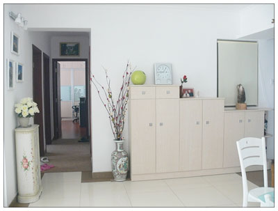 過(guò)道全景,進(jìn)門直通的通道對(duì)著墻。高低有致的是訂做的鞋柜。市面上賣的鞋柜老貴,而且規(guī)格還不太適合偶家,于是訂了一個(gè),整套打造1400多,省錢之余還利用空間。