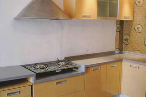 人造石櫥柜臺面,襯板不可少!有的使用條形襯板,有的使用整體襯板,還有的使用一種結(jié)構(gòu)架,不管怎樣,對臺面的保護支撐是必須的。墊板用三條寬100毫米,厚15毫米以上的刨花板或密度板即可,用玻璃膠前中后固定在臺面背面。臺盆和灶口加豎形墊板。全鋪墊板要用防潮板材,以免墊板受潮變形影響臺面。