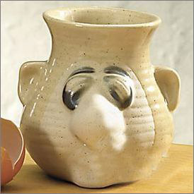 它由陶瓷制成,不過外形上看上去很特別,被做成了一個大鼻子先生的樣子。這也正是其創(chuàng)意的獨到之處,你只要將蛋殼敲碎,將雞蛋放進這個容器里面,然后慢慢傾斜,它就能夠讓蛋清流出,留住蛋黃。不過,當(dāng)?shù)扒鍙乃拇蟊亲永锩媪鞒鰜頃r,就像是一股股的鼻涕一樣……