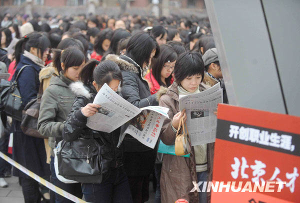 3月4日,參加招聘的女大學(xué)生在北京市畢業(yè)生就業(yè)市場(chǎng)排隊(duì)等候入場(chǎng)。當(dāng)日,北京市2009年女大學(xué)生專場(chǎng)招聘會(huì)在北京市畢業(yè)生就業(yè)市場(chǎng)舉辦,北京各行業(yè)近50家企事業(yè)單位共推出600余個(gè)崗位,吸引了5000多名女大學(xué)生入場(chǎng)。據(jù)介紹,這是北京市連續(xù)第5年舉辦女大學(xué)生專場(chǎng)招聘會(huì)。主辦方表示,此次進(jìn)場(chǎng)的所有崗位都是針對(duì)女大學(xué)生設(shè)立。2009年北京地區(qū)將有高校畢業(yè)生21萬(wàn)余人,北京生源畢業(yè)生達(dá)到9萬(wàn)多,其中女大學(xué)生比例超過(guò)五成。新華社記者 羅曉光攝