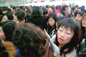 昨天(4日)上午9點(diǎn),女大學(xué)生專場(chǎng)招聘會(huì)在北京市畢業(yè)生就業(yè)市場(chǎng)舉辦。此次招聘會(huì)共有50家企事業(yè)單位參加,600個(gè)崗位提供給前來(lái)應(yīng)聘的女大學(xué)生。市人事局畢業(yè)生就業(yè)服務(wù)中心統(tǒng)計(jì),截至下午2點(diǎn)招聘結(jié)束時(shí),約5000人參加招聘,平均8人爭(zhēng)取1個(gè)崗位。