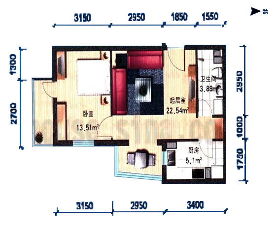 2.臥室南向開個(gè)陽臺(tái),使臥室有較好的日光照射和通風(fēng),感覺舒適。