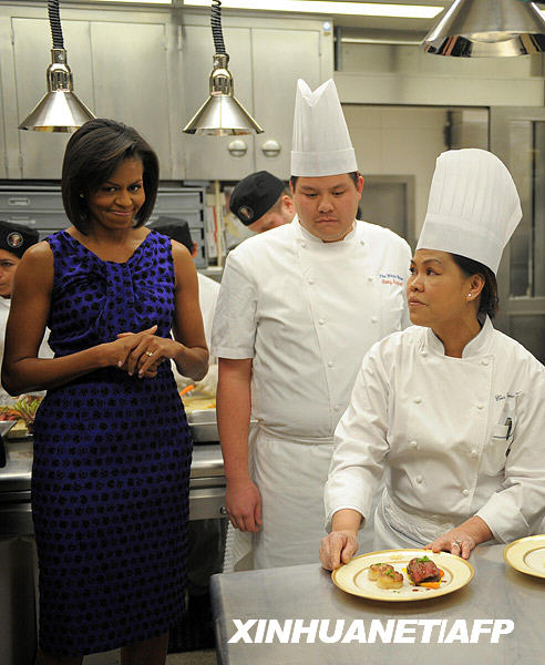 2月22日,在美國華盛頓白宮的廚房里,美國“第一夫人”米歇爾·奧巴馬(左)探望為宴請州長的晚餐而忙碌的廚師們。新華社/法新
