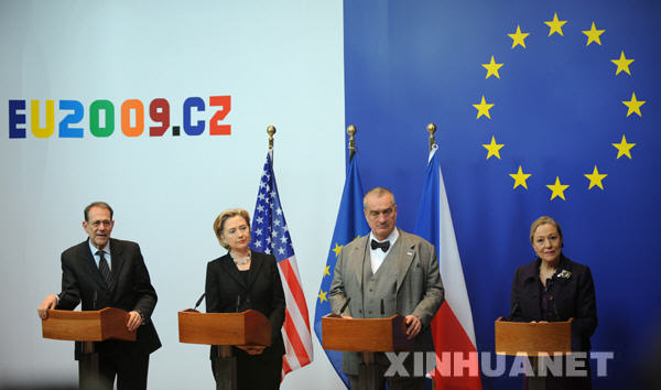 3月5日,在比利時首都布魯塞爾的歐盟總部,歐盟負責外交與安全事務的高級代表索拉納、到訪的美國國務卿希拉里·克林頓、歐盟輪值主席國捷克外長施瓦岑貝格和歐盟委員會負責對外關系和歐洲睦鄰政策的委員瓦爾德納(從左至右)共同會見記者。美國國務卿希拉里·克林頓當天到訪歐盟,并將于當晚在瑞士日內(nèi)瓦與俄羅斯外長拉夫羅夫舉行會談。新華社記者武巍攝