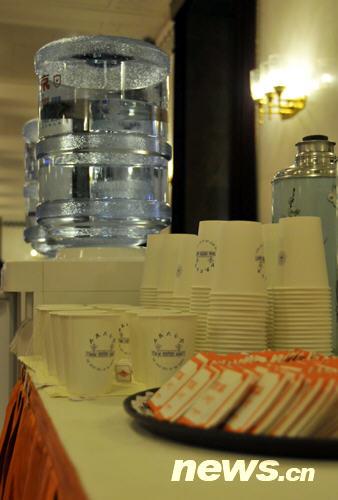 供大家飲用的水、茶(陳濤 攝)