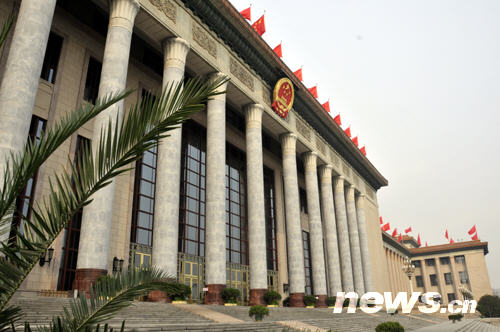 人民大會堂紅旗飄飄迎接兩會(陳濤 攝)