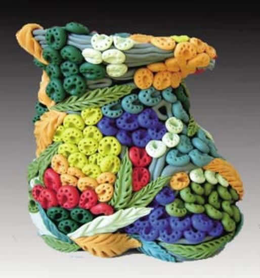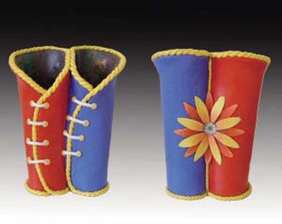整體造型像一只靴子,寓有“飛步前行、蒸蒸日上”之意。而花瓶通體被五顏六色的果實及樹葉包圍,更有五谷豐登、繁榮昌盛之意。