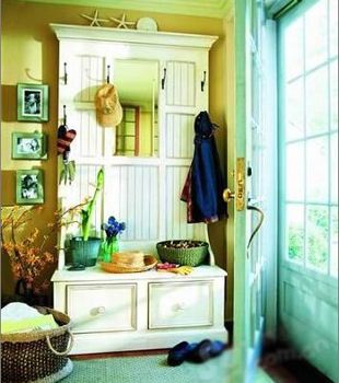 下面的柜體放置脫換的鞋子,平臺(tái)部分正好可以坐在上面方便穿脫,上面的箱板釘幾個(gè)掛鉤,就能懸掛出門的行頭、帽子和書包,是快速整理妝容的好幫手。