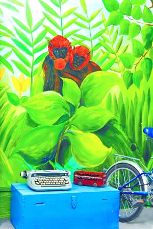 除了滿目的布,讓家的色彩流動起來外,另一個不可忽略的主題就是涂鴉,這些親自畫上去的圖案和文飾,賦予了家不羈的個性和氣質(zhì)。在居室里任何一個可以利用的角落,都成為王瑩瑩涂鴉的“畫板”。墻壁上巨大的涂鴉畫作就不必說了,綠色的大樹生機(jī)蓬勃。樓梯扶手被刷上了大紅色,樓梯則是采用了自然的木色和黑色,甚至是花盆也涂上了濃艷的黃色或藍(lán)色。