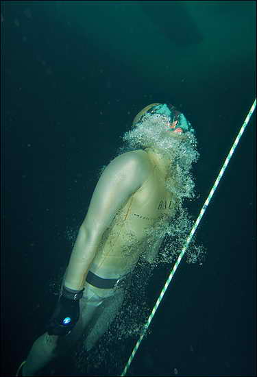 攝影師達(dá)恩-布爾頓稱:“這是世界首個(gè)冰下自由潛水比賽,這不是一個(gè)很輕松的挑戰(zhàn)。我們都只穿著一件濕式潛水衣,冒著大雪走了近3.2公里才到達(dá)比賽舉行地點(diǎn),所以,這是一個(gè)很艱難的挑戰(zhàn)?!?