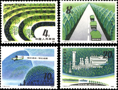 1980年3月12日,即我國第一個植樹節(jié),原郵電部發(fā)行《植樹造林,綠化祖國》特種郵票,全套4枚,第一枚“經(jīng)濟(jì)林”,面值4分;第二枚“四旁綠化”,面值8分;第三枚“飛播造林”,面值10分;第四枚“廠礦綠化”面值20分;1990年3月12日,即我國第十一個植樹節(jié),原郵電部發(fā)行《綠化祖國》特種郵票,全套4枚,第一枚“全民義務(wù)植樹”,面值8分;第二枚“城市綠化美化”,面值10分;第三枚“建設(shè)綠色長城”,面值20分;第四枚“林茂糧豐”,面值30分。兩套植樹造林郵票,圖案都以不同層次的綠色為基調(diào),清新淡雅的畫面,將人們從喧囂的世界中帶入了一個綠色、靜謐的世界,令人賞心悅目,心曠神怡。