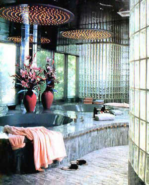 您是否也想象過自己能擁有一間如此豪華的浴室呢?玻璃鏡墻、滿天星式圓盤頂燈的選用,不僅拓展了空間,更增添了浴室的豪華氣派。其實,您也不妨試一下,并非要花費很多錢的。