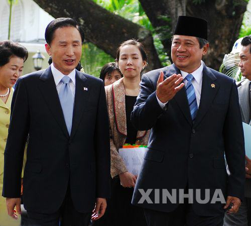 印尼總統(tǒng)府,印尼總統(tǒng)蘇西洛(前右)歡迎韓國總統(tǒng)李明博(前左)到訪。當天,李明博抵達雅加達,開始對印尼進行為期3天的訪問。新華社記者岳月偉攝