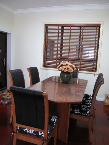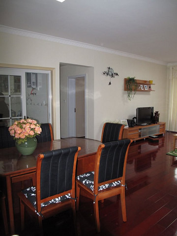 一進(jìn)門就是餐廳,餐廳和客廳沒(méi)隔斷。餐桌也掌上明珠的,櫻桃木的,木質(zhì)很好挺穩(wěn)重。。。