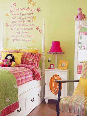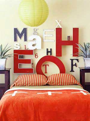 這估計(jì)是最有創(chuàng)意最簡(jiǎn)單的床頭設(shè)計(jì)了。用一種歡快的字體在床頭的位置題寫一句孩子最喜歡的箴言。