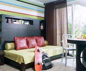 這個(gè)設(shè)計(jì)比較適合小男子漢的臥房。整個(gè)床頭就是一個(gè)大大的靠枕。感覺上是那樣的舒服和柔軟。