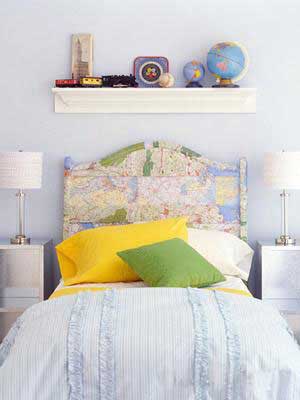 如果你的孩子是個(gè)天生的旅游愛好者,那么把他的床頭設(shè)計(jì)成四海的地圖無疑是再好不過了。床頭上的置物架上還可以擺放小地球儀。裝飾用的地圖最好是選用防水材質(zhì)的,經(jīng)久耐用而且易于清潔。