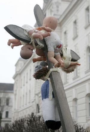 **人群手舉十字架,上面掛著死嬰