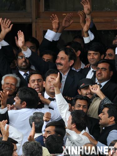 3月16日,在巴基斯坦伊斯蘭堡,喬杜里(中、留胡子未系領(lǐng)帶者)和律師們參加慶?;顒印0突固箍偫砑?6日發(fā)表電視講話,宣布恢復(fù)喬杜里巴基斯坦最高法院首席大法官的職務(wù)。喬杜里在2007年11月巴前總統(tǒng)穆沙拉夫?qū)嵭芯o急狀態(tài)時被解職。 新華社記者饒博攝