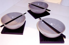 更值得一提的是這家店里的調(diào)料瓶的設(shè)計,完全顛覆了傳統(tǒng)瓶瓶罐罐給人的單調(diào)和油膩的感覺。有的是兩個等高的亞光錫制圓柱體小容器立在胡桃木的木制底托上,造型和顏色的搭配表現(xiàn)出明顯的西方設(shè)計的嚴(yán)謹(jǐn)和藝術(shù)性。兩個小容器的頂部鑿上幾個小孔,就是兩個精致的鹽罐和胡椒罐。還有的是兩外立蛋式的小圓容器,同樣的財質(zhì)和色澤中間可以分開,也是放調(diào)味品的。還有的乍一看是橢圓柱體的白色瓷瓶,再一看,原來是兩個日月形狀疊加的,上端也有著同樣的小孔,也是兩個漂亮的調(diào)料瓶。也有的是兩個扁平蛋形的小白色瓷器,色澤盈潤,造型精致,有著東方設(shè)計的韻味,上面也有幾個小孔,也是調(diào)味瓶。這些小瓷器下面都有胡桃木的底墊,放置在桌上不失為精致的小飾品,而裝上了調(diào)味道料,就成了功能性極強(qiáng)的調(diào)味瓶,這樣的家飾品,哪個愛美的家庭主婦會不喜歡呢?