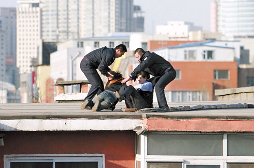 關(guān)鍵時刻,隱藏在一旁的兩名男警察迅速跑了過去,把兩人死死拽住,將兩人拉到了樓頂。圍觀人群中爆發(fā)出了熱烈的掌聲?!斑@女警察!好樣的!”
