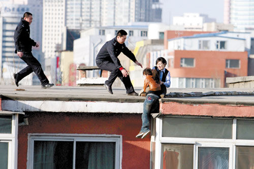 女警拉住跳樓女瞬間