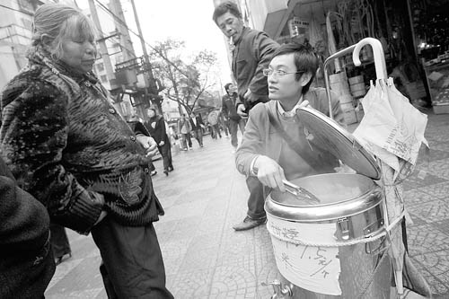2月16日,重慶,從大學(xué)房地產(chǎn)專業(yè)畢業(yè)的曾天才賣了3年房子后,走上街頭,賣起了玉米。曾天才說:“大學(xué)畢業(yè)賣玉米,我并不覺得是一件難堪的事情,而是對自己的一種歷練。我想學(xué)一門技術(shù),以后自己創(chuàng)業(yè)。” 圖片來源:重慶晨報