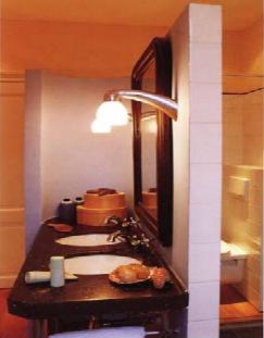 方形的鏡子,鑲著瓷磚的墻和圓形的洗浴盆、燈光、貝殼與盒子形成了一種平衡。方形、四邊形代表了人對有序和平衡的向往。方形和圓形的快樂組合象征了'坤'的平衡。在這間沒有向外開的窗戶的洗浴室里,大大的鏡子提升了空間感;在它的對面掛一張相片、一幅畫或其他什么自然的事物也能使這間洗浴室和外界聯(lián)系起來。