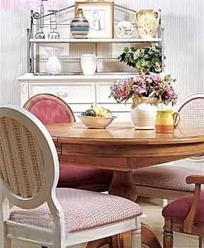 由于不少家庭出于戶型的考慮,并未特地開(kāi)辟家居餐廳,但卻可以稍費(fèi)心思在客廳的某個(gè)位置標(biāo)新立異,于是一個(gè)特殊的就餐環(huán)境便能在客廳的范圍內(nèi)“渾然天成”。白色櫥柜因?yàn)殍F藝擱架的設(shè)計(jì)變得有些與眾不同,上面可以擺放些物品,集收納、展示于一體。而原木色餐桌與方格布藝餐椅椅墊相互搭配,形成悠閑清爽的地中海風(fēng)格。就餐的心情便像地中海的微風(fēng)迎面吹來(lái)般享受愜意。