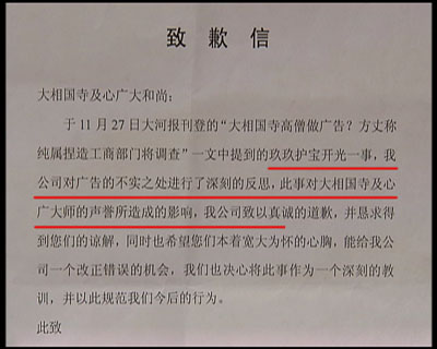 記者對(duì)玖玖理療褲的虛假?gòu)V告進(jìn)行調(diào)查時(shí),河南開封大相國(guó)寺向記者出具了一份玖玖理療褲河南開封經(jīng)銷商,寫給大相國(guó)寺的一封致歉信,承認(rèn)自己假冒僧人的錯(cuò)誤行為,從此廣告中來自大相國(guó)寺的高僧空智,就如同人間蒸發(fā),再也沒有出現(xiàn)過,取而代之的是佛教禪宗第36代傳人,但卻有著相同的名字和面孔——空智。