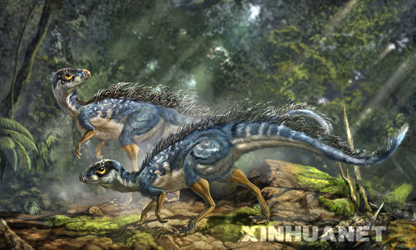 中國科學(xué)家在遼西發(fā)現(xiàn)了一種“帶有最原始羽毛的恐龍”——孔子天宇龍。這一恐龍新屬種的發(fā)現(xiàn)不僅將異齒龍類恐龍的分布擴展至亞洲,而且填補了羽毛早期演化中的一個空白。圖為孔子天宇龍復(fù)原圖。新華社發(fā)