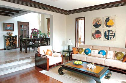 最具中式特色的家具就是圈椅。但圈椅最大的劣勢就是坐著不是很舒適。所以我們可以完全把它作為客廳里的裝飾,放在客廳的一角。而客廳的主角還應該是舒適的布藝沙發(fā)。在選擇這類沙發(fā)時還應該注意,可以選擇一些在設計上也具有中式特色的沙發(fā),比如帶有木框結構的沙發(fā)。這樣可以將中式的韻味體現(xiàn)得更濃一些。再有,除了圈椅之外,中式小茶桌、中式木墩、石墩都是不錯的點綴家具。