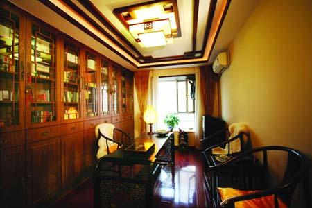 床前漆面斑駁的木箱雖略顯滄桑,卻使文雅意境愈加沉穩(wěn);牽動(dòng)細(xì)膩心思的胭脂粉簾,仿古而不泥古;臥榻兩側(cè)的地?zé)?,雕飾玲瓏有致;架子床溫情浪漫,伴著主人每晚安枕熟睡。字畫、玉石、鼓凳等的點(diǎn)綴,更一堂雅氣。