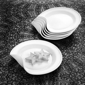 盤子的造型是很奇特,但是真的是為了方便實(shí)用。彎曲的卷邊,讓人能吃到最后的美味:把食物歸攏堆積到盤子邊上,就可以方便地取用。而不必像平盤那樣,把盤子送到嘴邊才能解決問(wèn)題。