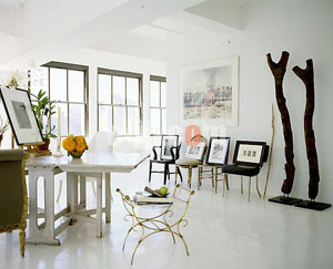 正如圖中所看到的那樣,椅子各式各樣各類風(fēng)格各個(gè)產(chǎn)地俱有:一把18世紀(jì)意大利的銀行椅,同樣是18世紀(jì)的法國(guó)椅;還有Vicente Wolf為自己設(shè)計(jì)的黑色不銹鋼椅子。