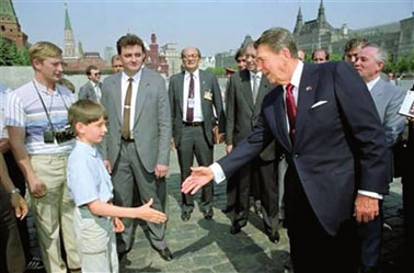 英國《每日電訊報》網(wǎng)站19日登出蘇扎拍攝于21年前的一張照片:里根訪問蘇聯(lián),在時任蘇聯(lián)領(lǐng)導人米哈伊爾·戈爾巴喬夫陪同下參觀莫斯科紅場,遇見一群蘇聯(lián)游客并與他們交談。
