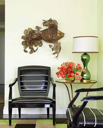 另一個(gè)小起居室,從綠色“做主”演變到藍(lán)色“當(dāng)家”,嫩綠的色彩作為點(diǎn)綴。墻上的版畫是裝飾的重點(diǎn)。