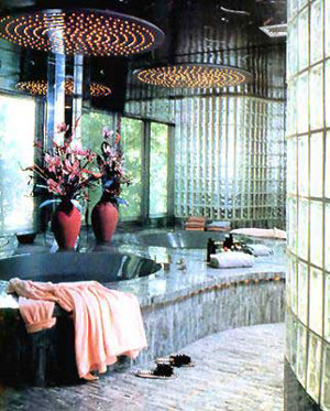 您是否也想象過自己能擁有一間如此豪華的浴室呢?玻璃鏡墻、滿天星式圓盤頂燈的選用,不僅拓展了空間,更增添了浴室的豪華氣派。其實(shí),您也不妨試一下,并非要花費(fèi)很多錢的。
