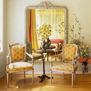 起居室的墻壁上低低地懸掛著老式穿衣鏡,鏡中照出對(duì)面的兩用坐臥長(zhǎng)椅、黃色帷帳和三腳架茶幾,再搭配上兩把30年代款式經(jīng)典的古董法式座椅,使這個(gè)角落充滿了懷舊氣息。絲綢帷帳和棉布椅套也銜接得恰到好處。