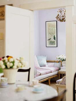 淡紫色調(diào)的家庭辦公室緊挨著餐廳,看起來(lái)很隱蔽,卻是這家人的減壓中心。一張竹條古董坐臥兩用床上鋪著顏色清爽華貴的織物,垂下的枝型吊燈是40年代的產(chǎn)物。只有墻上掛的圖畫(huà)讓人感覺(jué)原來(lái)生活在現(xiàn)代。