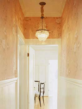 橙粉色的墻紙使走廊充滿浪漫氣息。線條流暢的壁板使空間顯得簡(jiǎn)潔寬敞,合適的高度避免了手指弄臟精美的墻紙。古老的枝型水晶吊燈成為了走廊的亮點(diǎn),使視線自然地轉(zhuǎn)移過(guò)來(lái)。建議在黑暗的走廊里懸掛水晶吊燈或淺粉色的燈泡,增添浪漫氣息。