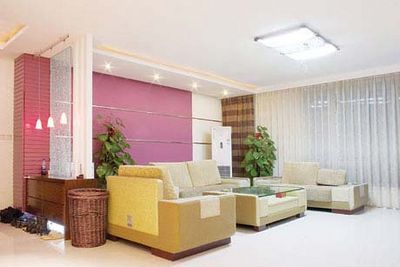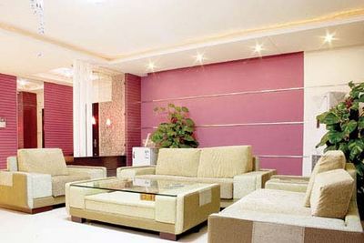 紫色背景墻最常用的地方是沙發(fā)背景墻。用紫色壁紙大面積鋪帖,只在柜式空調(diào)的后面留出相應(yīng)的白色部分,再用銀色金屬條橫著粘貼在壁紙上,既能保證整體色調(diào)的完整,又不會(huì)死板,而且銀色也是一種很高檔的顏色,整體看來很有品位。值得注意的是家具一定要選擇淺色的,不然客廳就會(huì)顯得很暗。